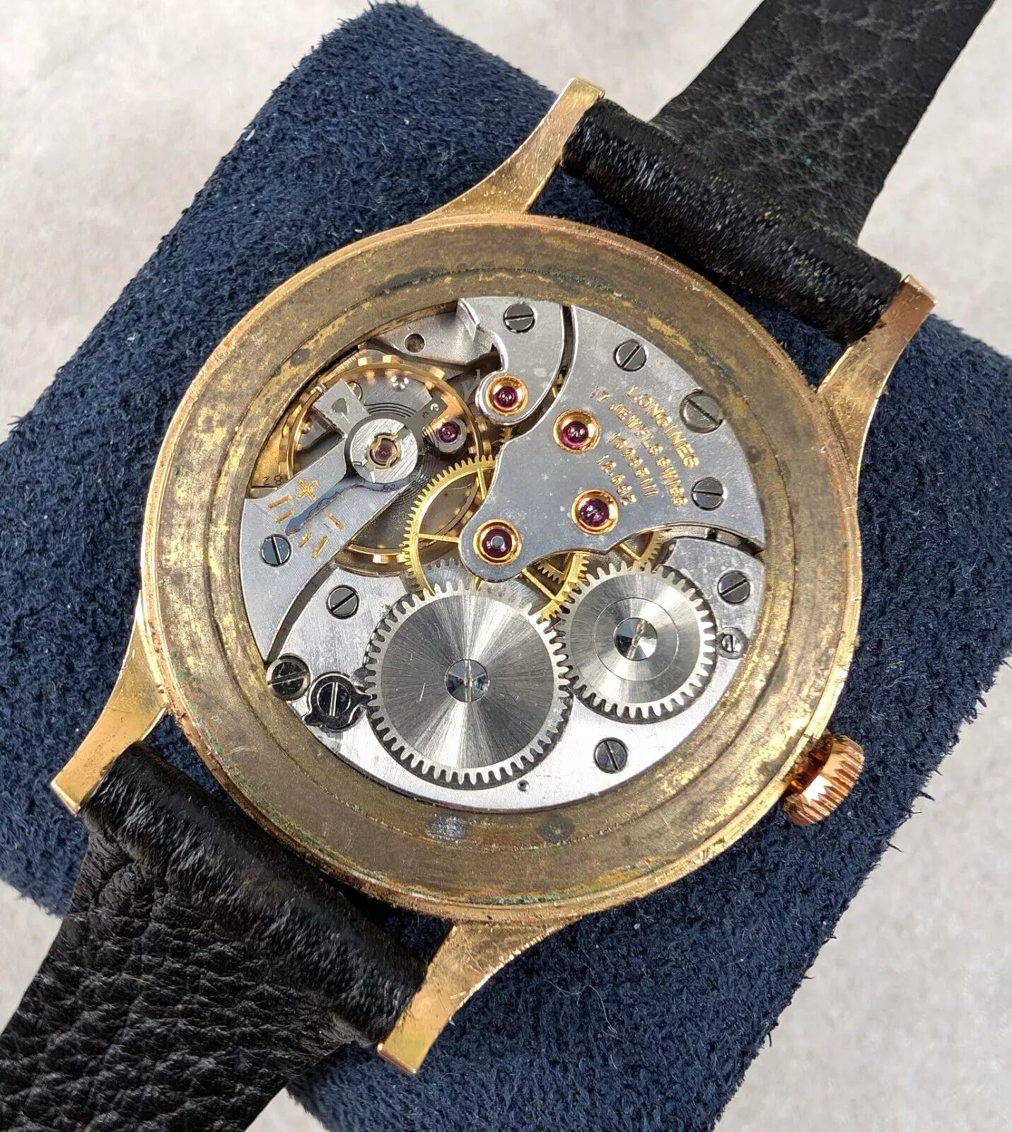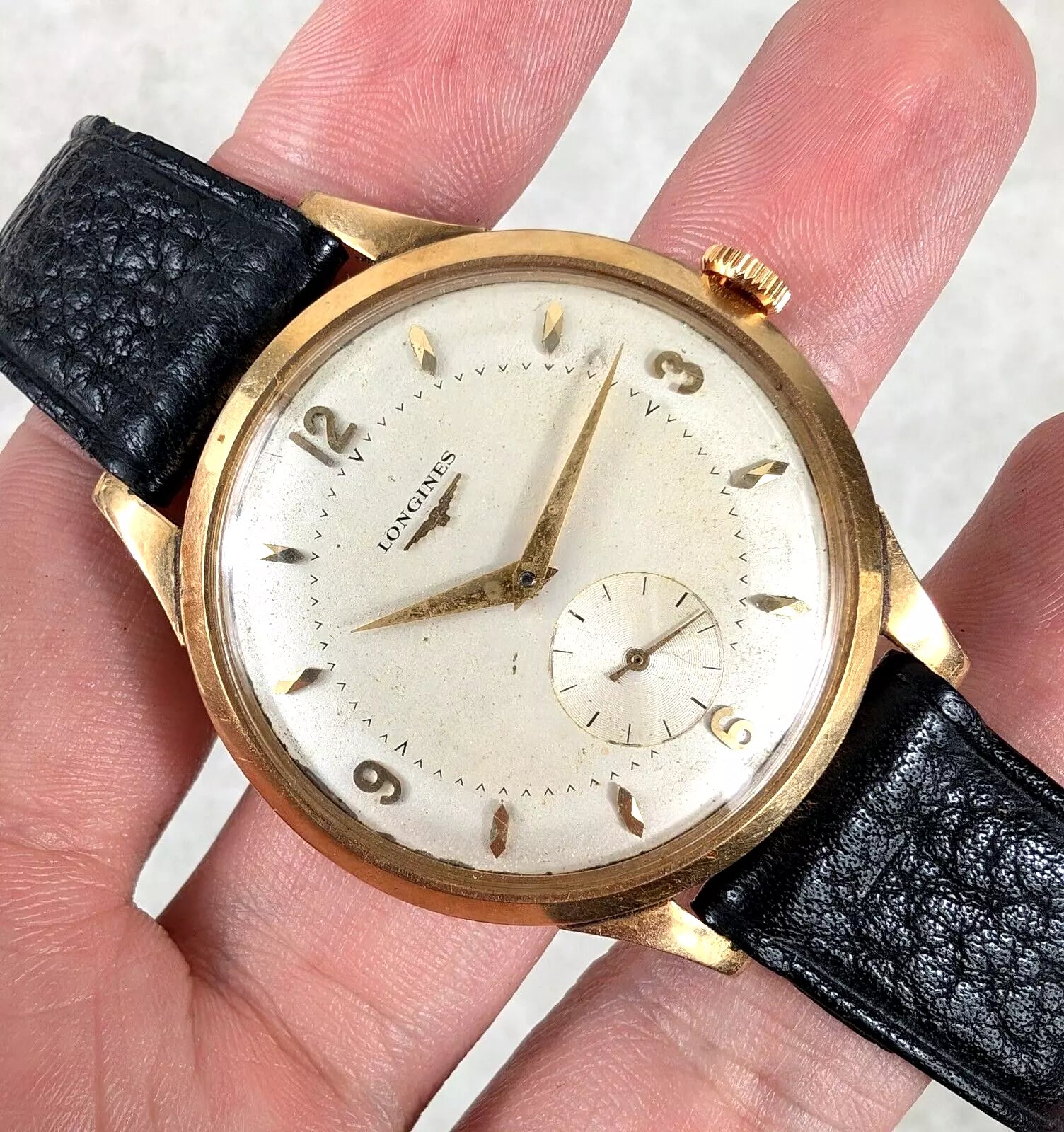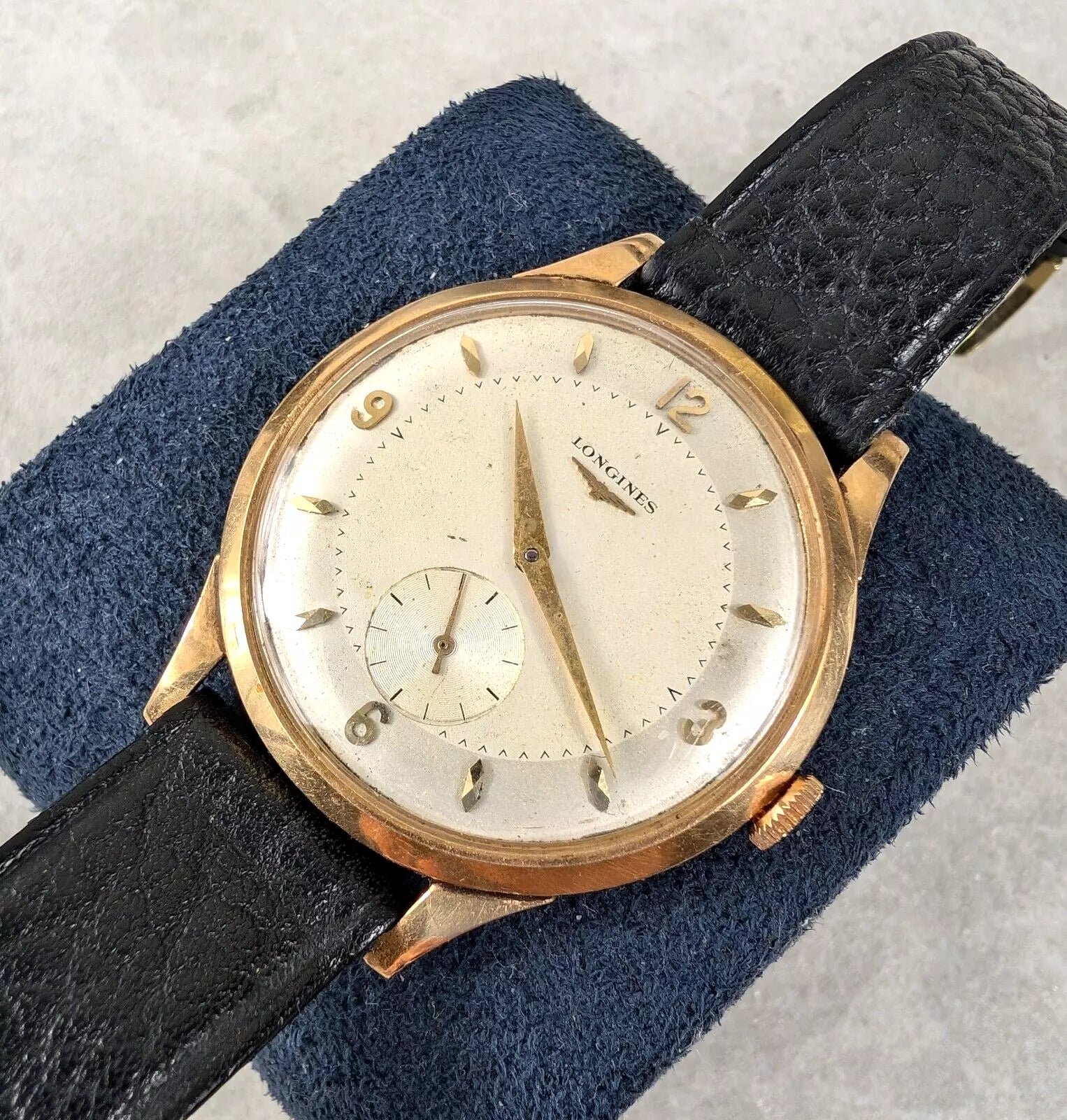 For sale we have a vintage 18ct gold Longines watch. The watch is fitted with a manual wind 12.68z movement. The serial number of the watch dates it to 1959 is is still in full working order. This is a large watch for the 1950s with a case diameter of approximately 36mm. This is a great vintage watch and would be a good addition to anyone's collection. As can be see from the photos the watch is in very good condition. Please feel free to ask any questions.