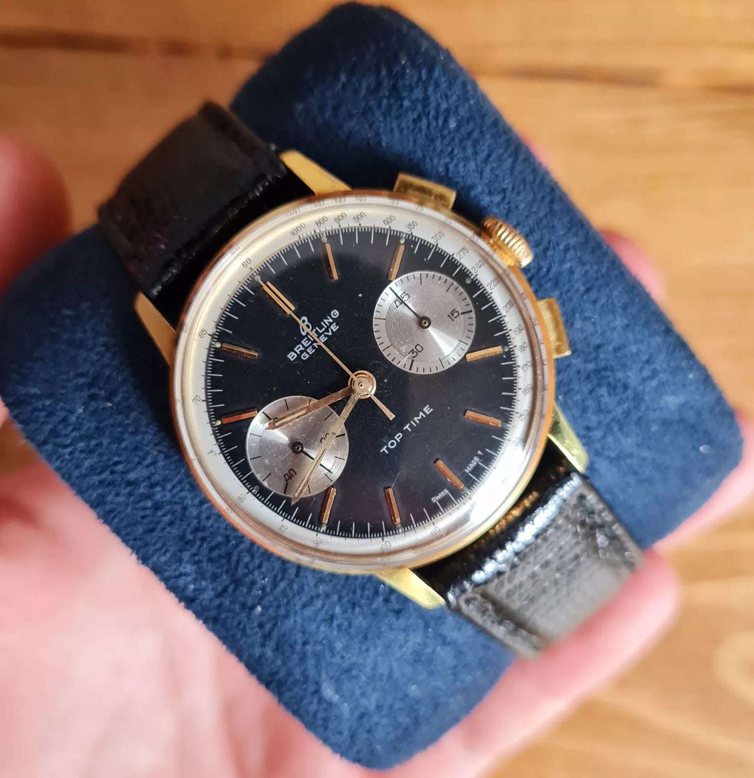 This is a true modern-day classic. The same model that was adapted as a Geiger counter for Sean Connery to wear as James Bond in “Thunderball” (1965) Top Times are probably the most sought-after vintage watch models right now and this one even more so for its iconic film connection, reverse Panda Dial and clean lines.