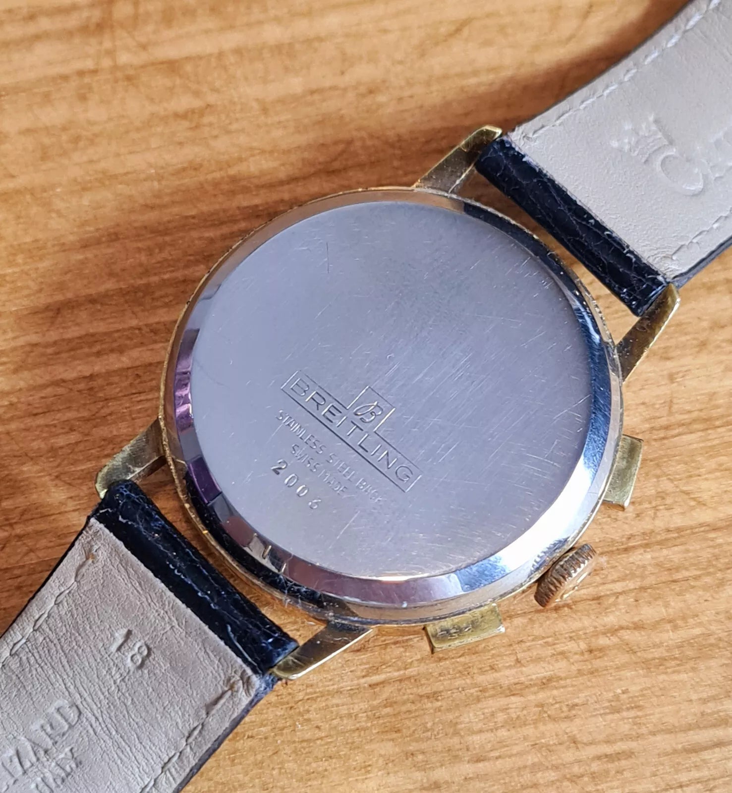 The 35mm case on this Reference 2003 Breitling is rose gold plated. The black reverse panda dial with silver sub registers is crisp and clear. The case shows some wear and scratches as you would expect for a nearly 50 year old watch. Having just been fully serviced he original signed crown winds smoothly. The chronograph functions well, with firm pushers. The timepiece is mated to a black leather Catterhalls strap which will fit up to a 7.5 inch wrist.