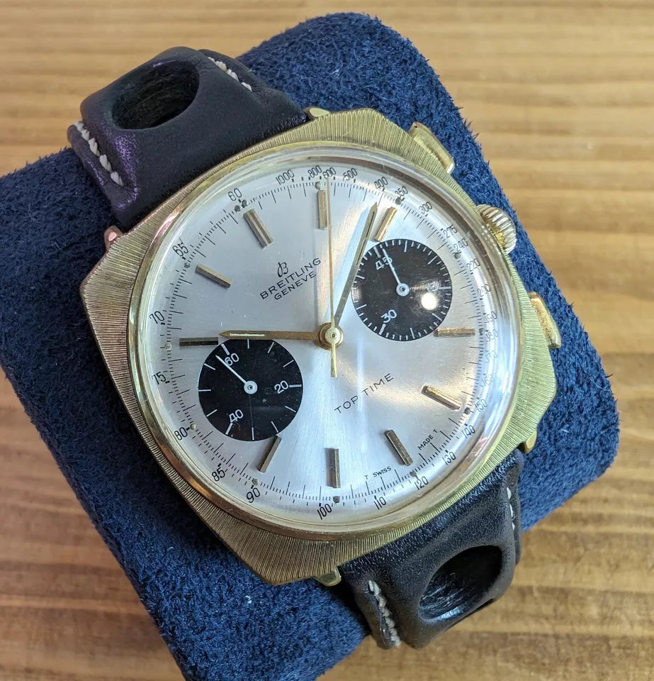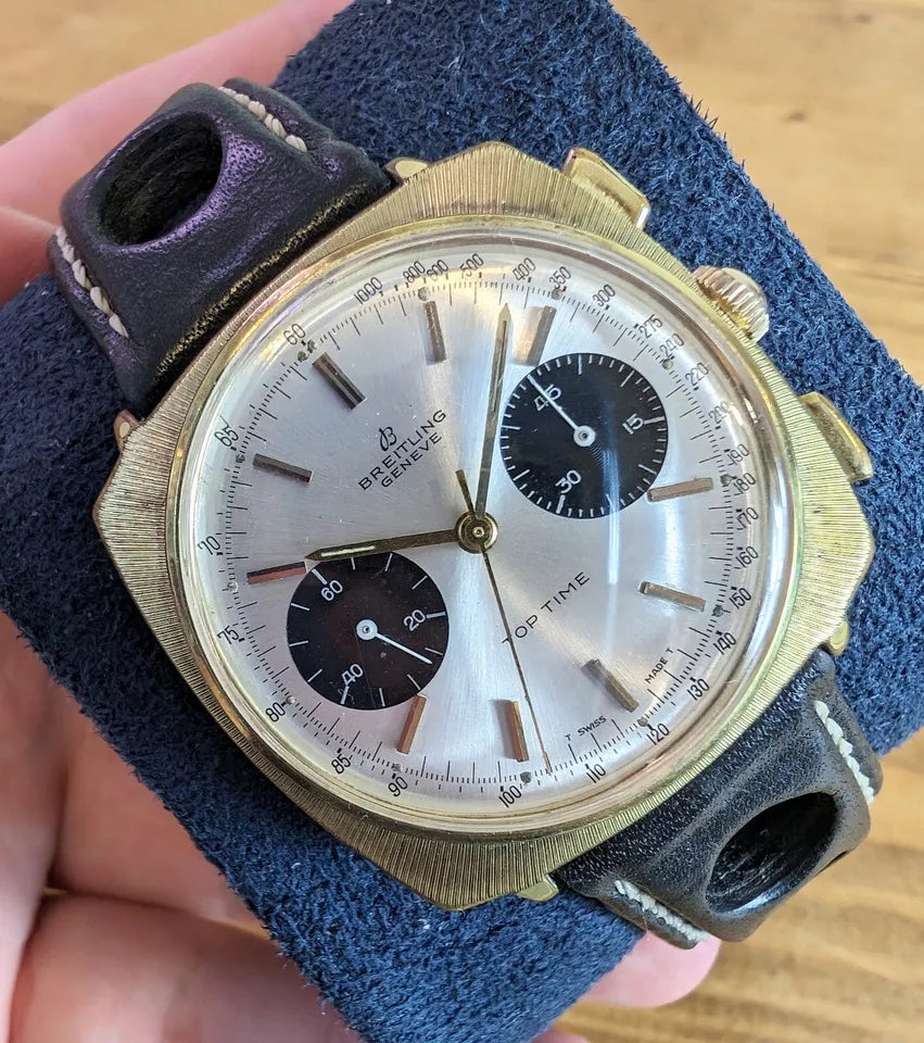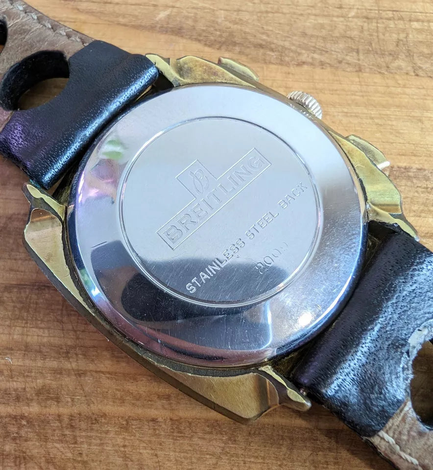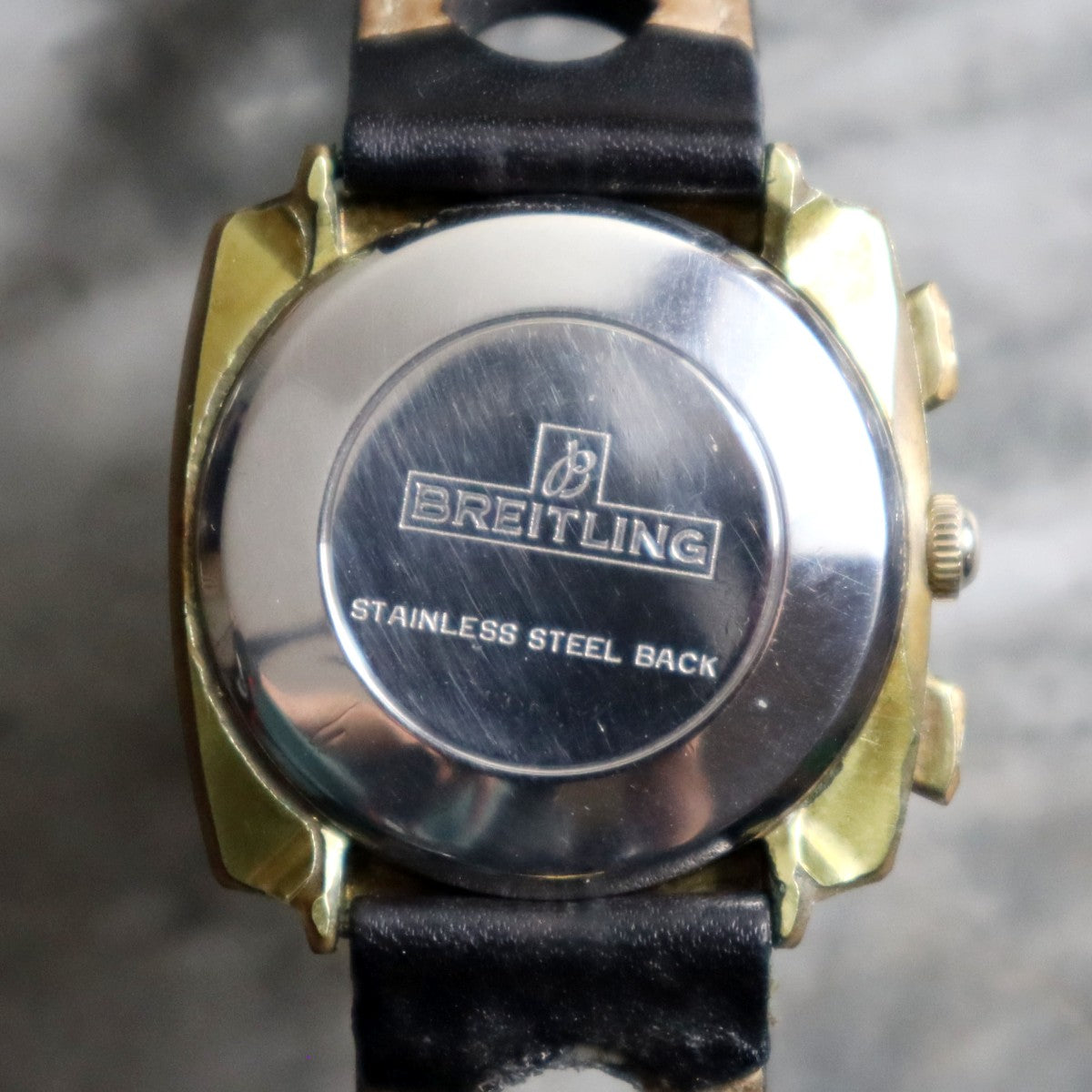 Gold plated square shaped case with sunburst design bezel. The case has not been repolished and is therefore in excellent condition with just a few marks commensurate with age. The case pushers are in good condition. The stainless steel clip on back is signed Breitling on the inside and outside and engraved with the 2009 model number on the outside dating it to c. 1966. The silver dial features the black auxillary dials design and is in nice original order.. The movement is a Valjoux calibre 7730 signed Breitling, manual wind chronograph, all functions working correctly and it has been serviced by our own watchmaker.