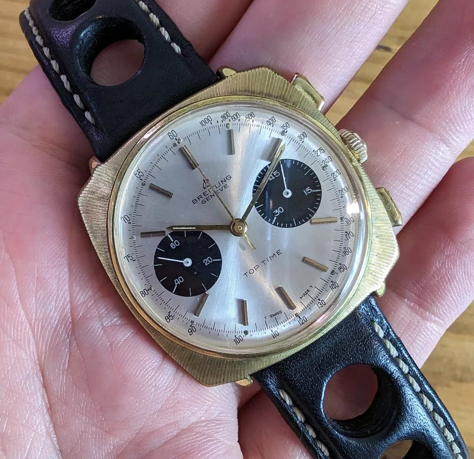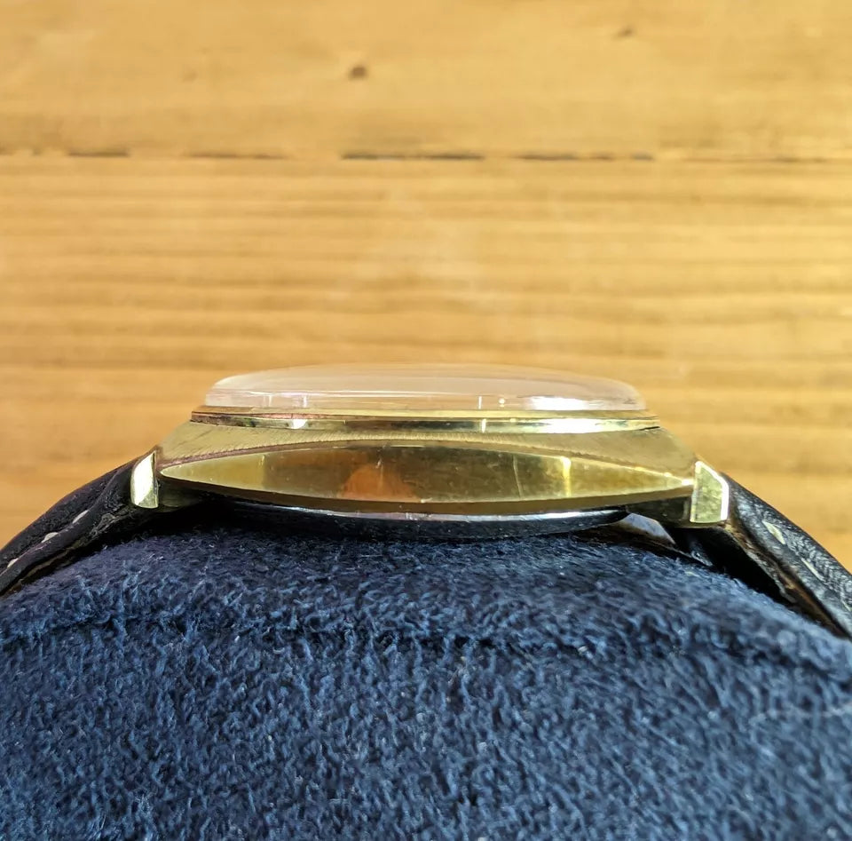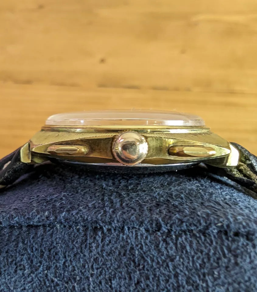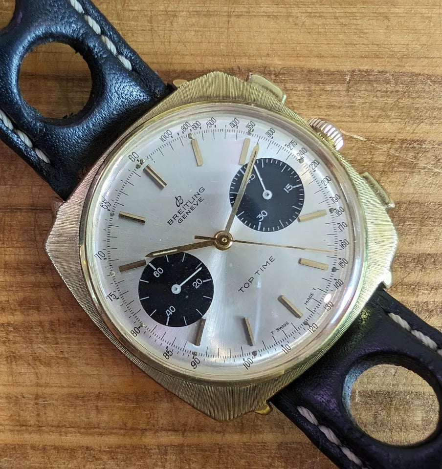 Gold plated square shaped case with sunburst design bezel. The case has not been repolished and is therefore in excellent condition with just a few marks commensurate with age. The case pushers are in good condition. The stainless steel clip on back is signed Breitling on the inside and outside and engraved with the 2009 model number on the outside dating it to c. 1966. The silver dial features the black auxillary dials design and is in nice original order.. The movement is a Valjoux calibre 7730 signed Breitling, manual wind chronograph, all functions working correctly and it has been serviced by our own watchmaker.