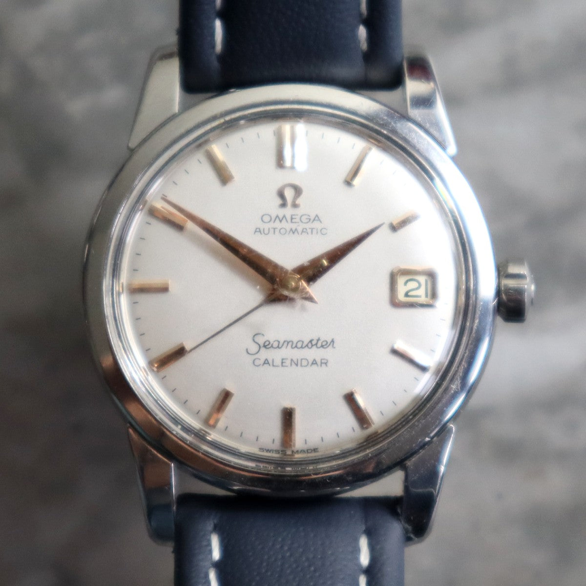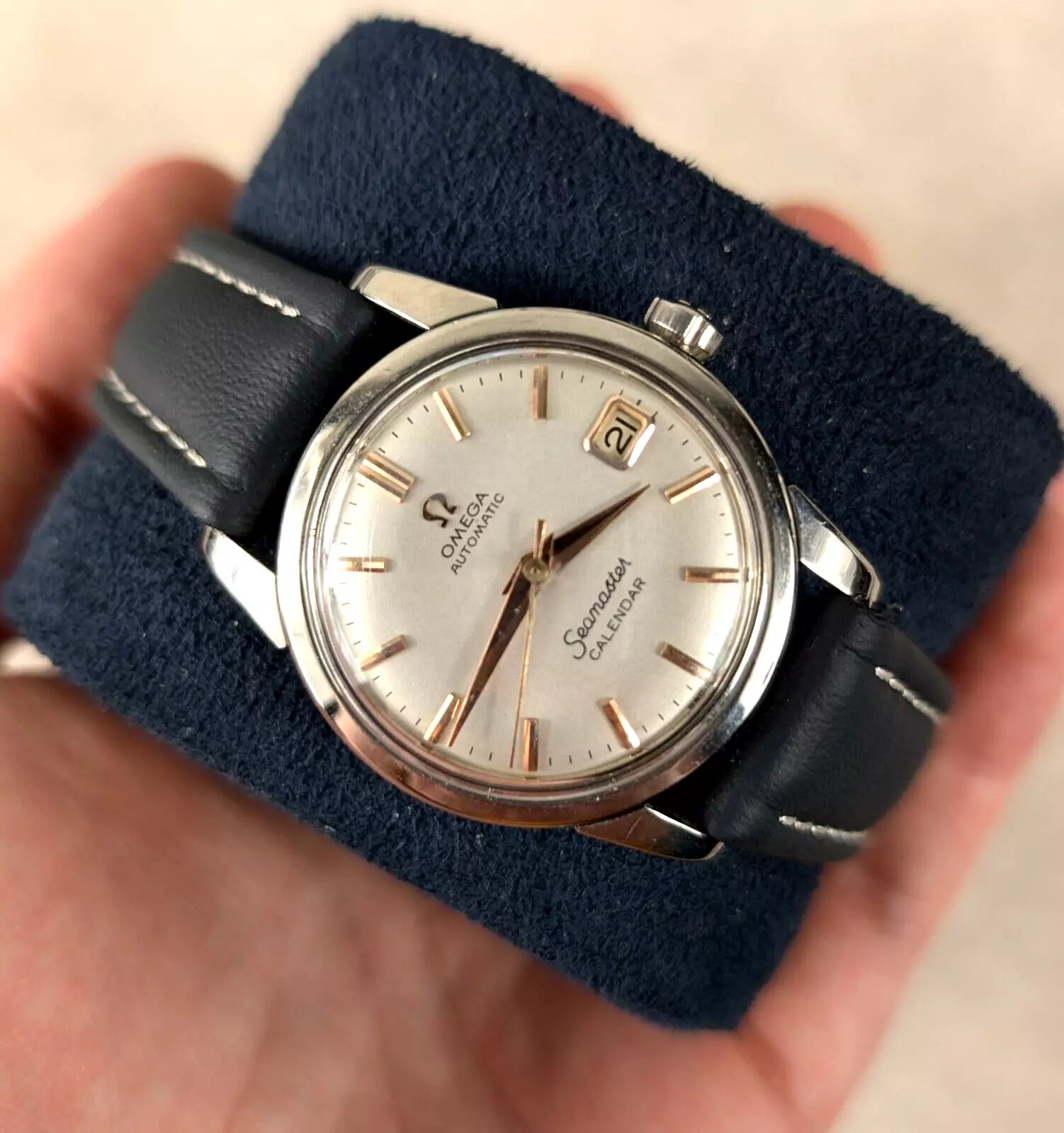 For sale we have a vintage Omega Seamaster Calendar. Named due to having a date window. The watch has a automatic calibre 503 movement and dates to the late 1950s. It is in excellent condition with a signed crown and buckle. The watch is in full working order and is a great addition to anyone's collection. Please feel free to ask any questions.