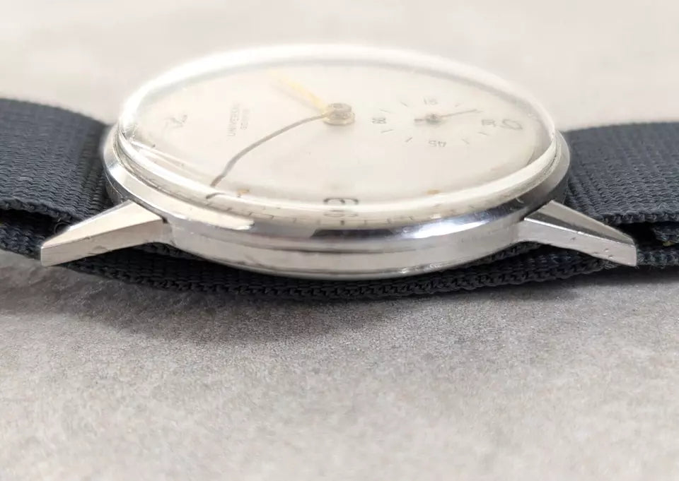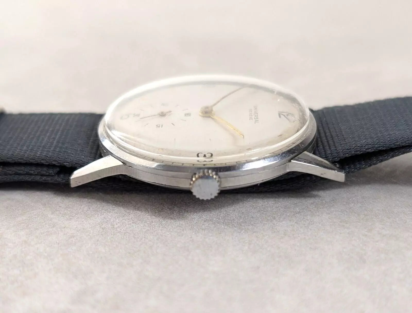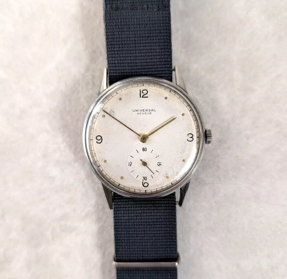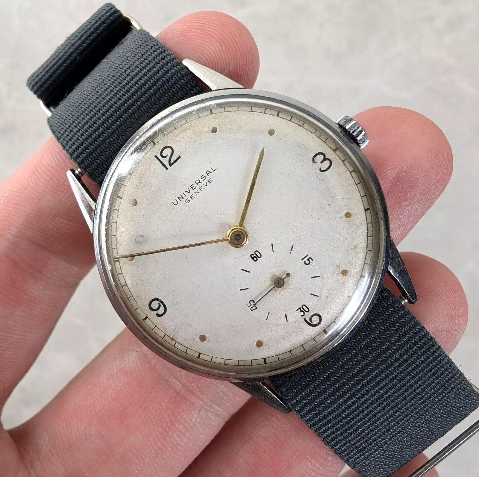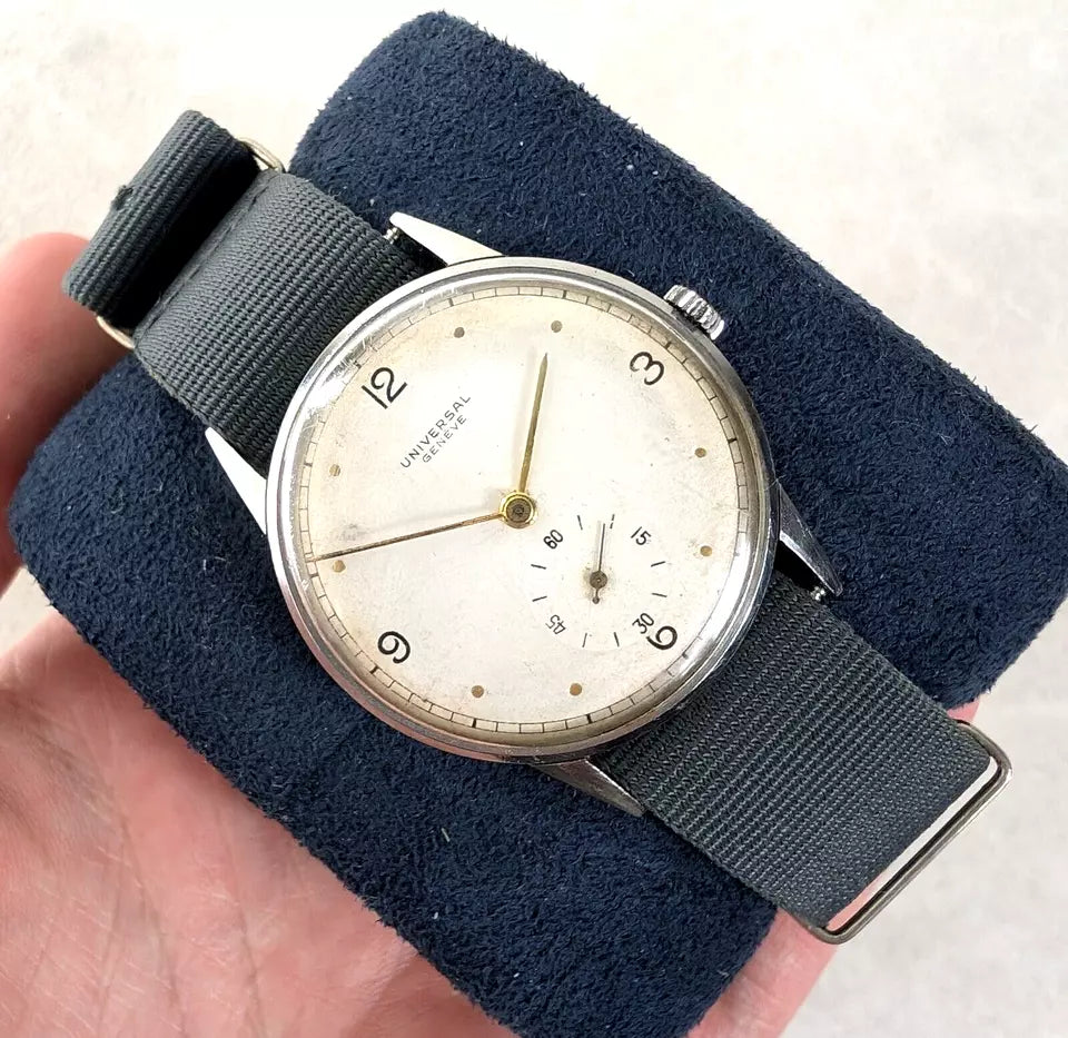 For sale we have a 1941 Universal Geneve vintage watch. The watch is fitted with a calibre 262 movement which is in working order. These watches are becoming increasingly collectable, this one features a very nice sub-second dial. The dial does show some signs of age, which we personally like to see on vintage pieces. For a watch manufactured over 80 years ago this watch still looks modern, with a thin case, sharp lugs and bauhaus arabic numbers.