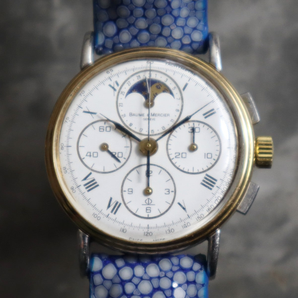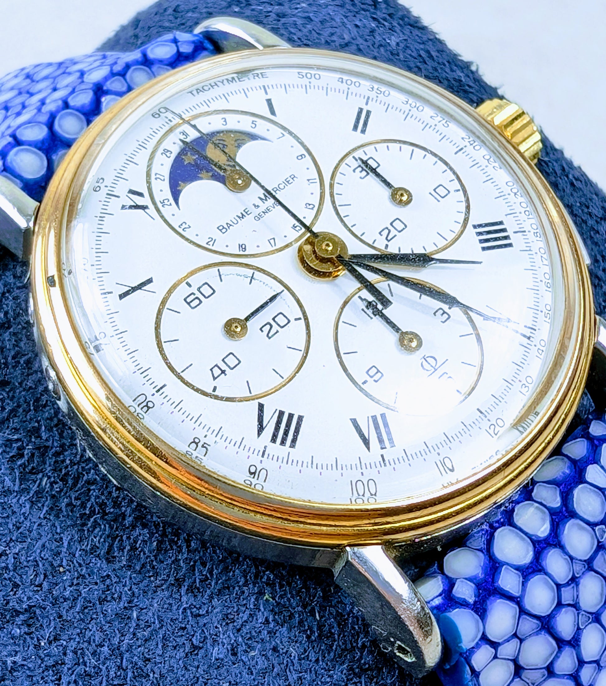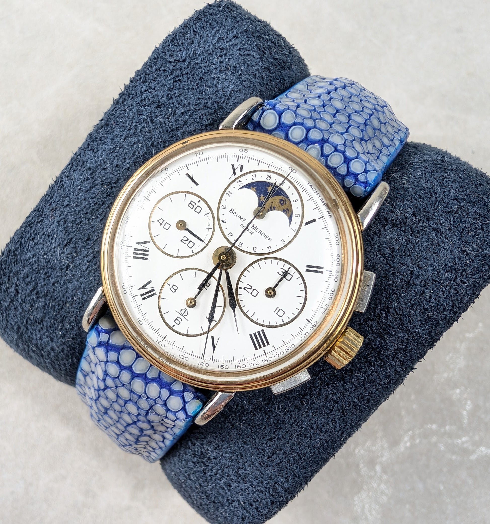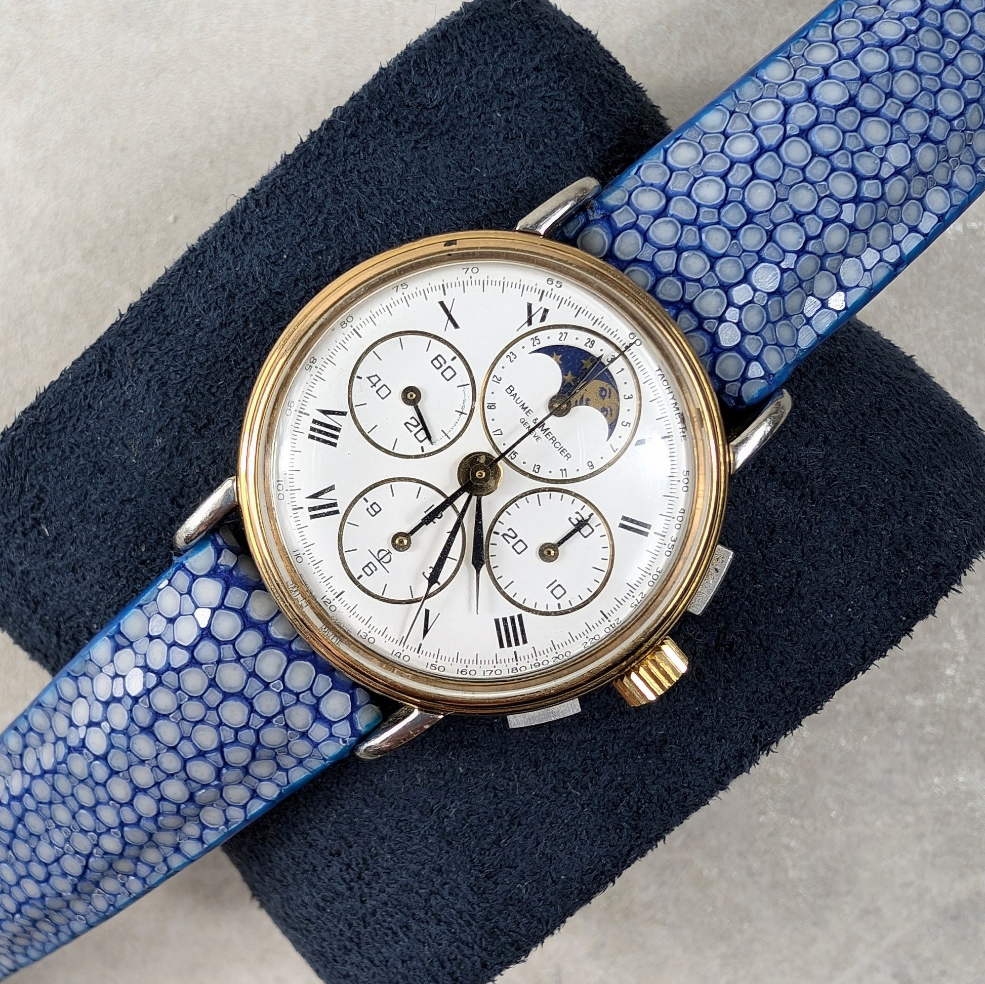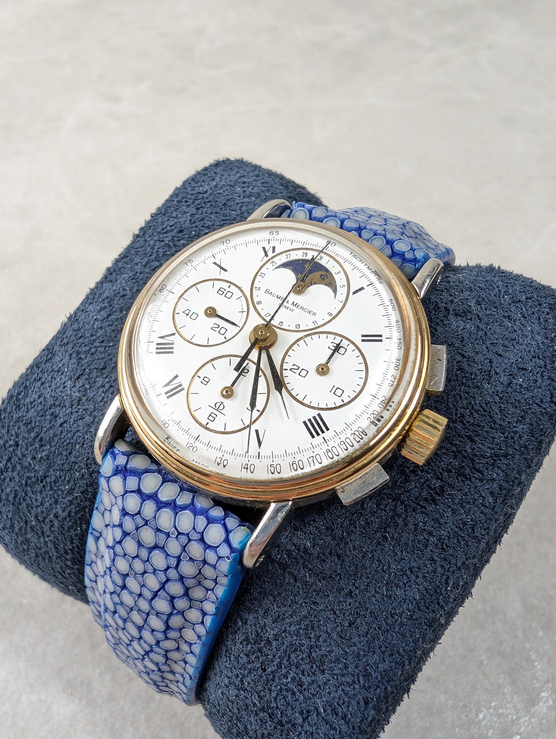 For sale we have a vintage 1980s Baume and Mercier Chronograph Moonphase. The case of the watch is a mix of stainless steel and gold, the watch is in good working order and is fitted with a distinctive blue strap. This is a manual wind watch with a case diameter of approximately 33mm. Please feel free to ask any questions.