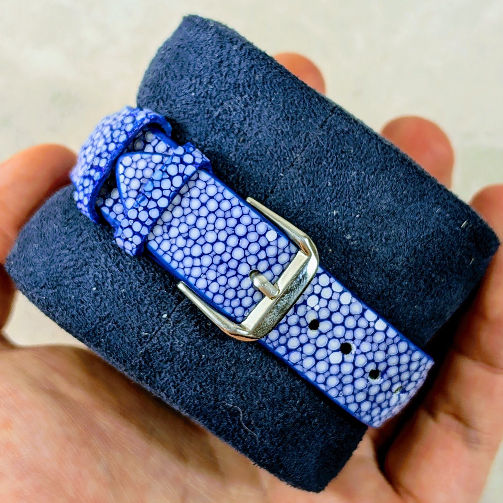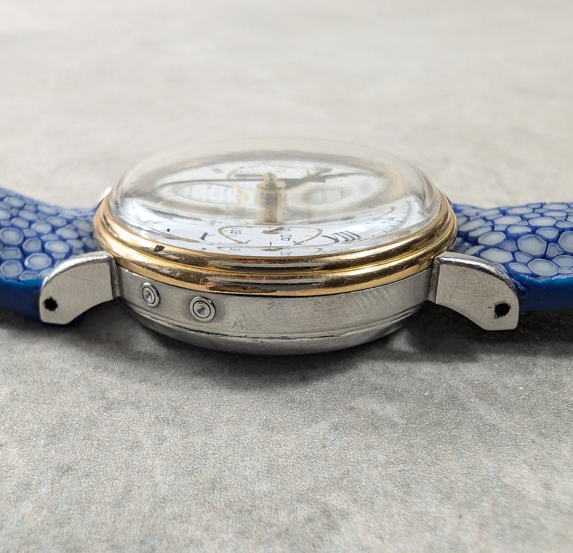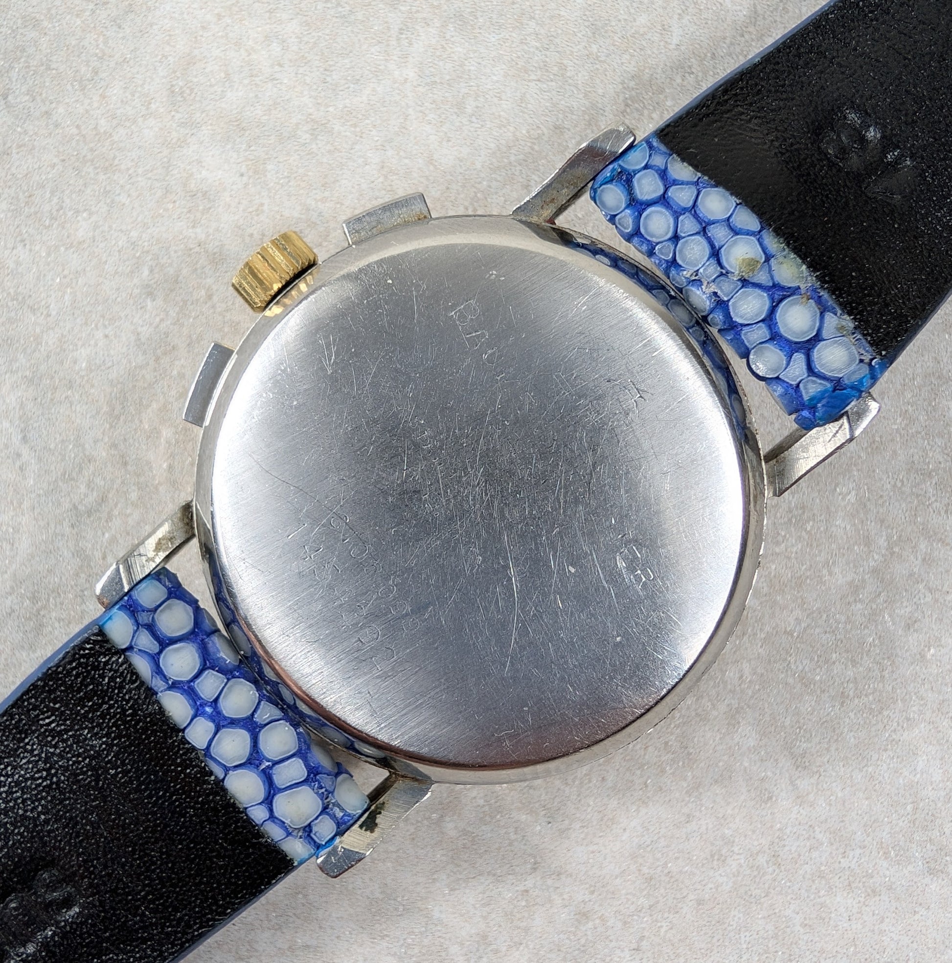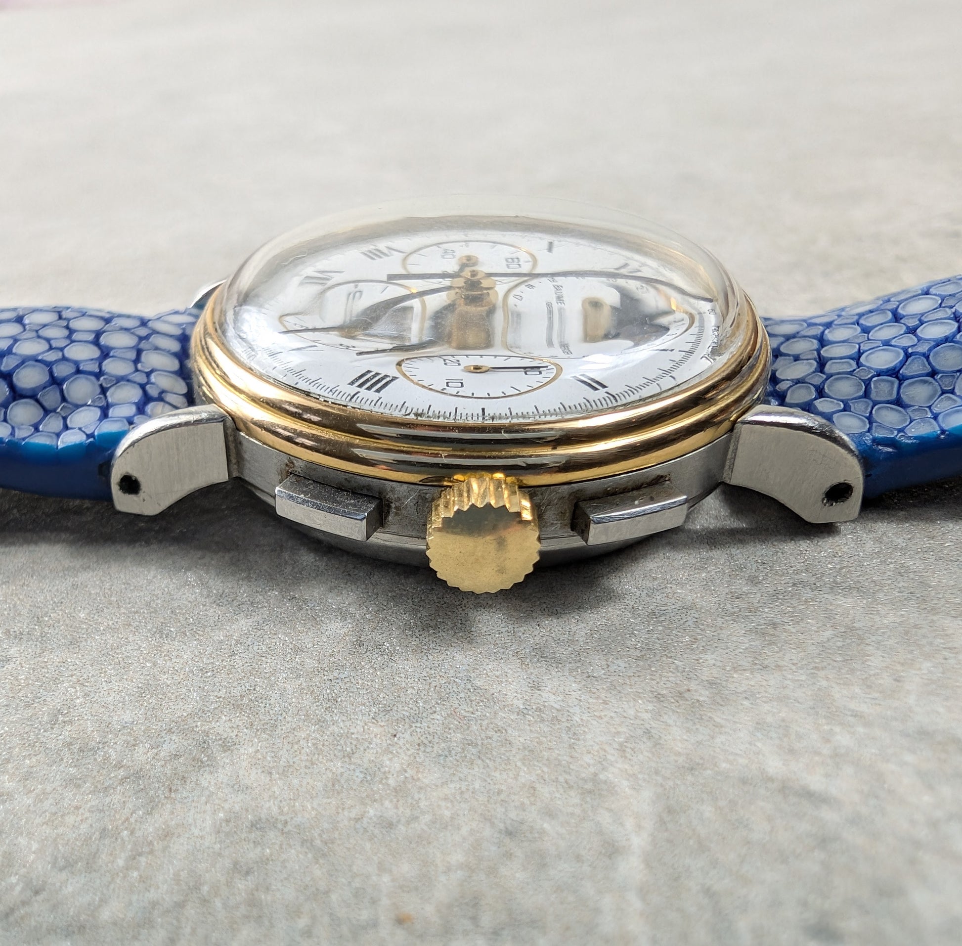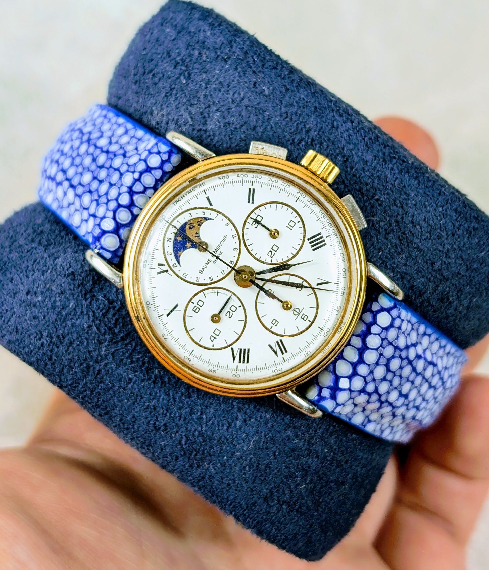 For sale we have a vintage 1980s Baume and Mercier Chronograph Moonphase. The case of the watch is a mix of stainless steel and gold, the watch is in good working order and is fitted with a distinctive blue strap. This is a manual wind watch with a case diameter of approximately 33mm. Please feel free to ask any questions.