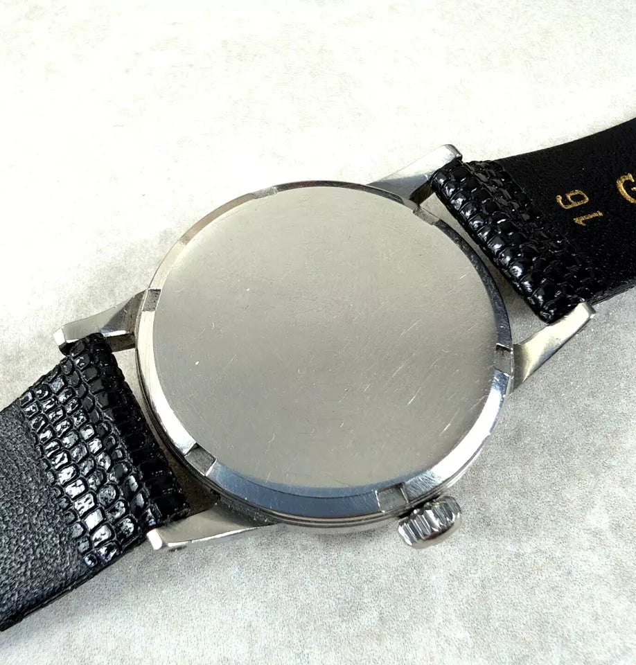 The diameter of the watch is 30mm without the crown and has a lug width of 16mm. This is a manual wind watch and is fitted with a R17.8SC 17 Jewel movement. This calibre movement was used on the series of military watches throughout WW2.